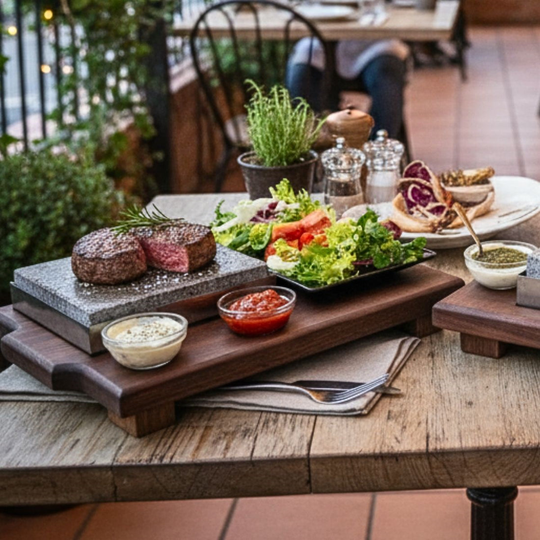 Piedra para Asar 20x20 con Base de Madera y tres salseros Disfruta una experiencia gastronómica...
