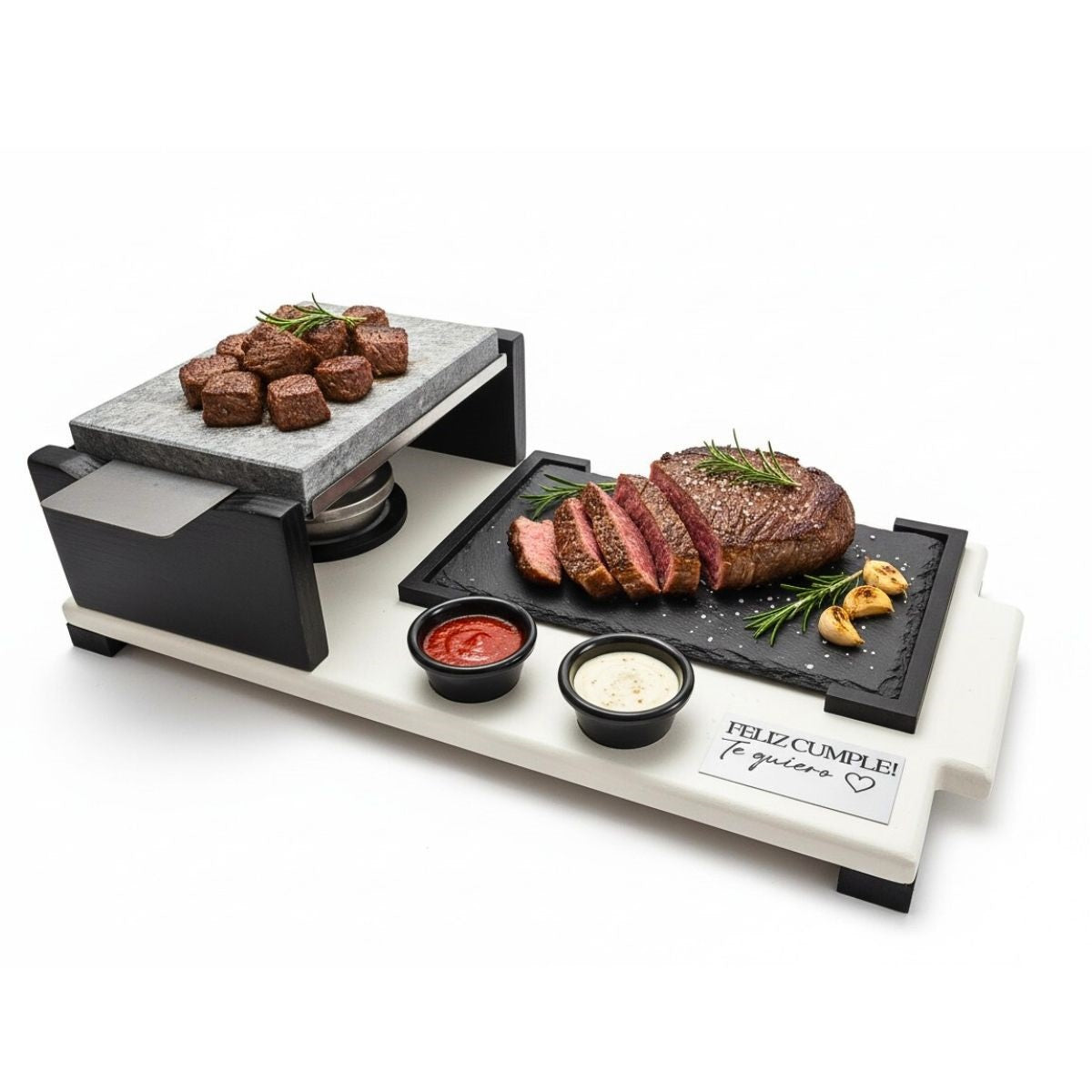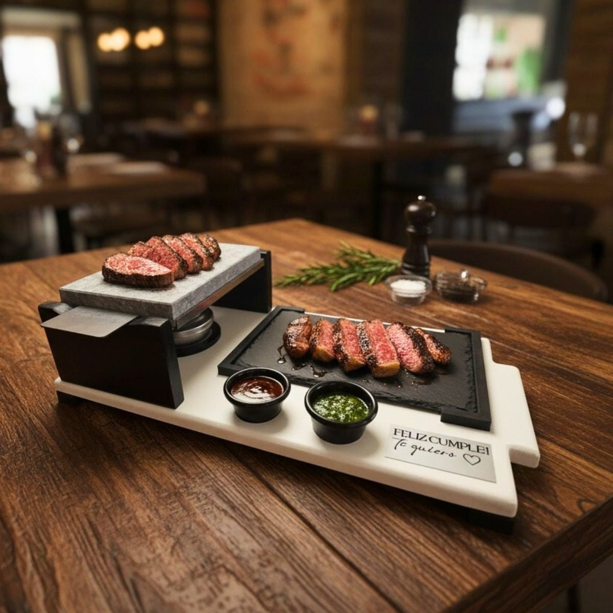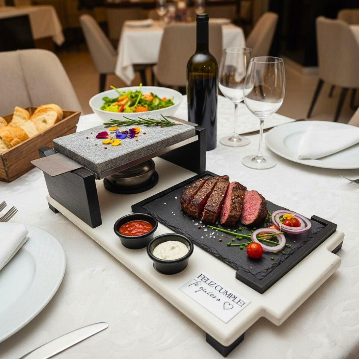 Surprise your customers with a unique culinary experience with this professional volcanic stone set with alcohol burner . Ideal for cooking and keeping meats, fish, or vegetables warm directly at the table, preserving all their flavor and texture.