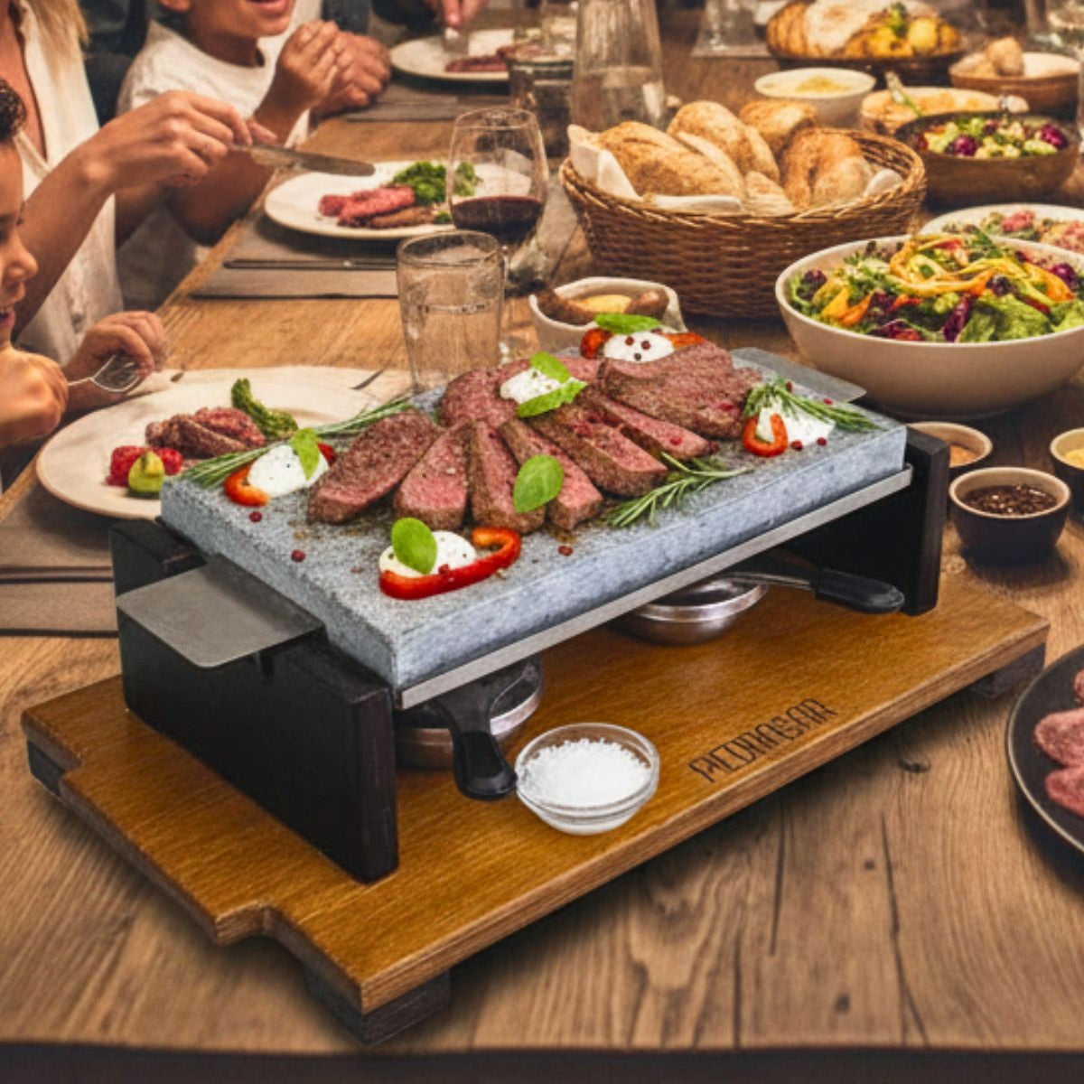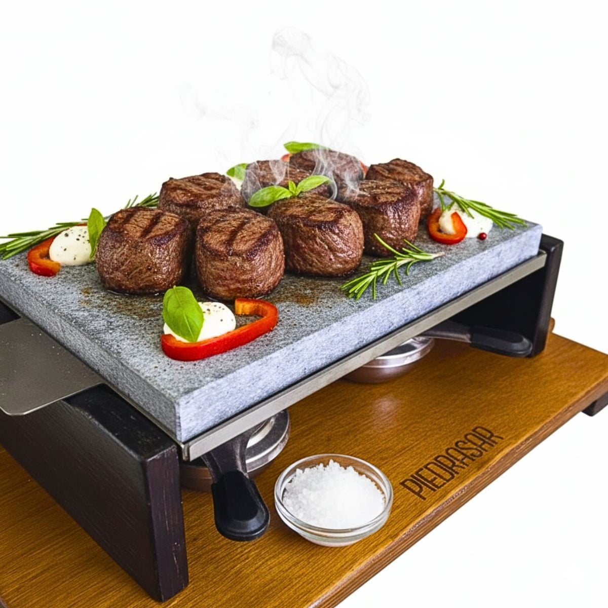 Enjoy the authentic taste of stone cooking with this elegant grilling stone set . Made from high-density natural volcanic stone , it retains heat for a long time, allowing you to cook meats, fish, seafood, or vegetables directly at the table to perfection.