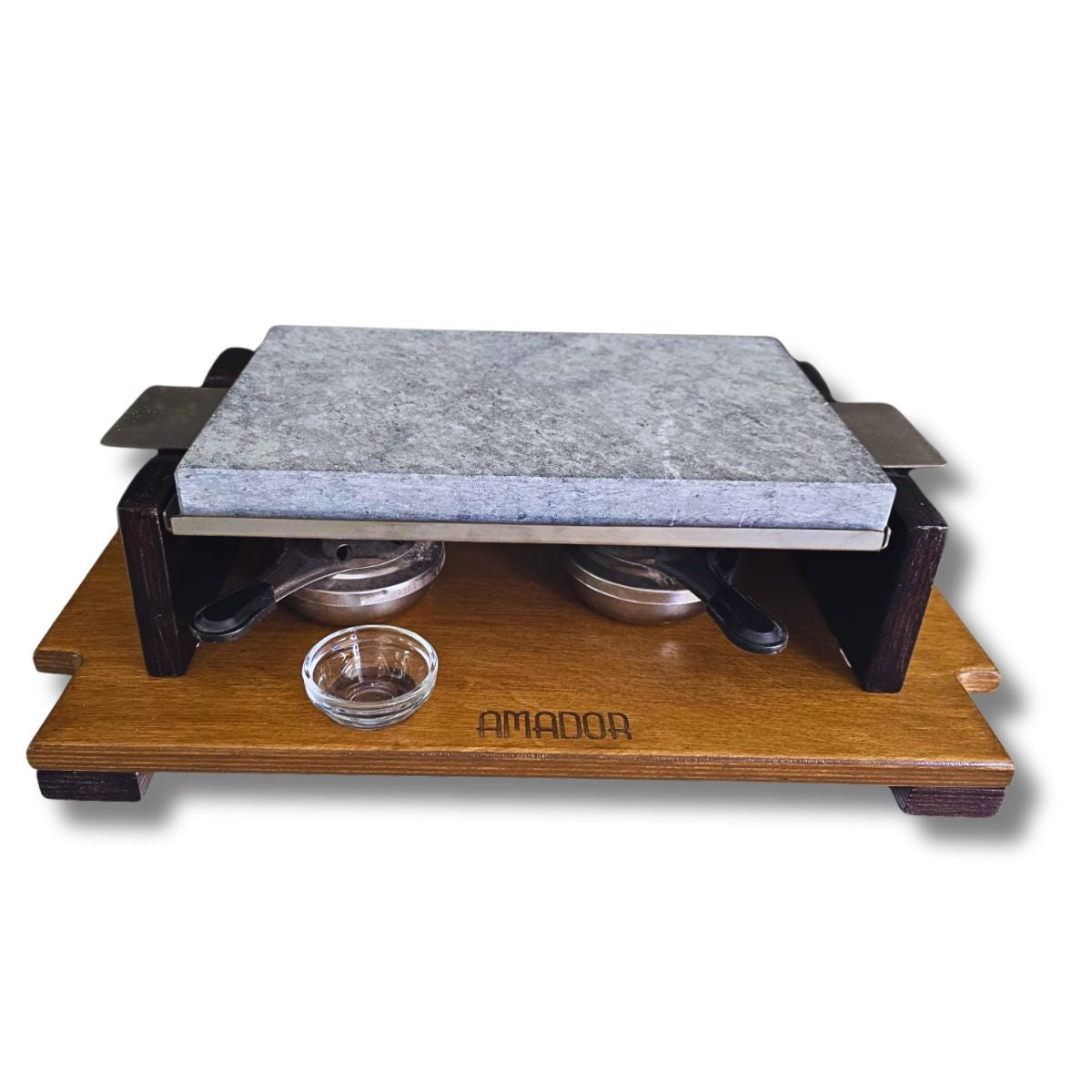 Its professional design includes a sturdy wooden base , a metal stand with two burners , and a 20x30 cm high heat retention stone that guarantees even and healthy cooking, without the need for oils or fats. 1 saucepan.