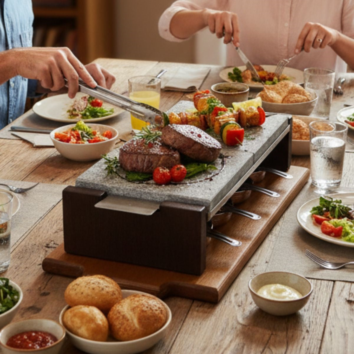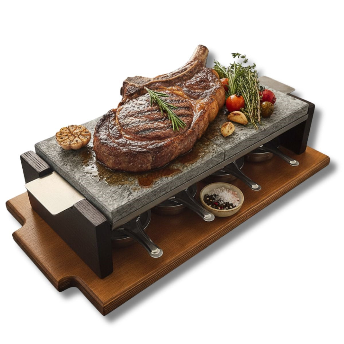 – For restaurants: For professional use, we recommend heating the stone in ovens that reach over 300 degrees Celsius. This ensures even heating, allowing all the stones to be placed inside at once. This speeds up service, and the customer will receive their order at the table very quickly. Once heated, the stone is placed on the steel tray using the stone lifter, and the burners are lit.