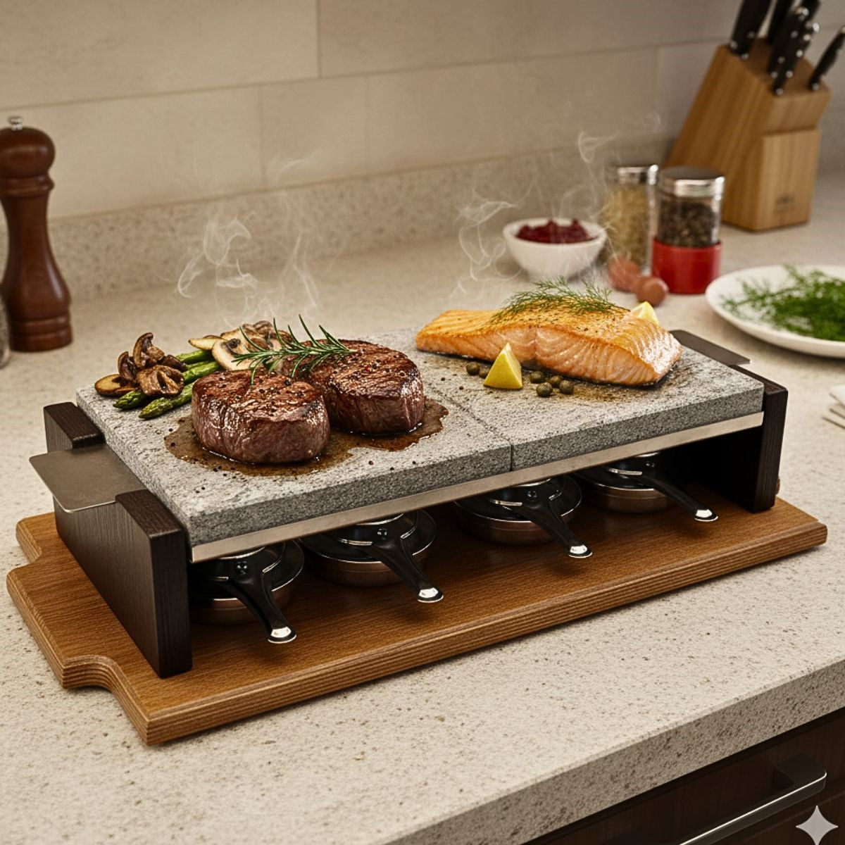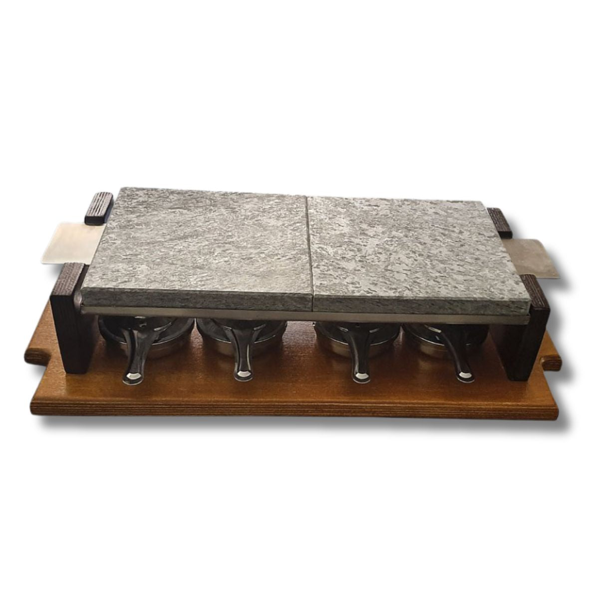 The Orejón 4-burner model features an oak-colored wooden base with walnut-colored wooden sides. It has an easily removable stainless steel tray that holds two 20x20x2.5cm volcanic meat stones, creating a 20x40x2.5cm cooking surface. It includes four alcohol burners and a stainless steel lifter. The Piedrasar volcanic stone is ideal for cooking because its natural properties offer excellent heat resistance, retain heat, and release it slowly.