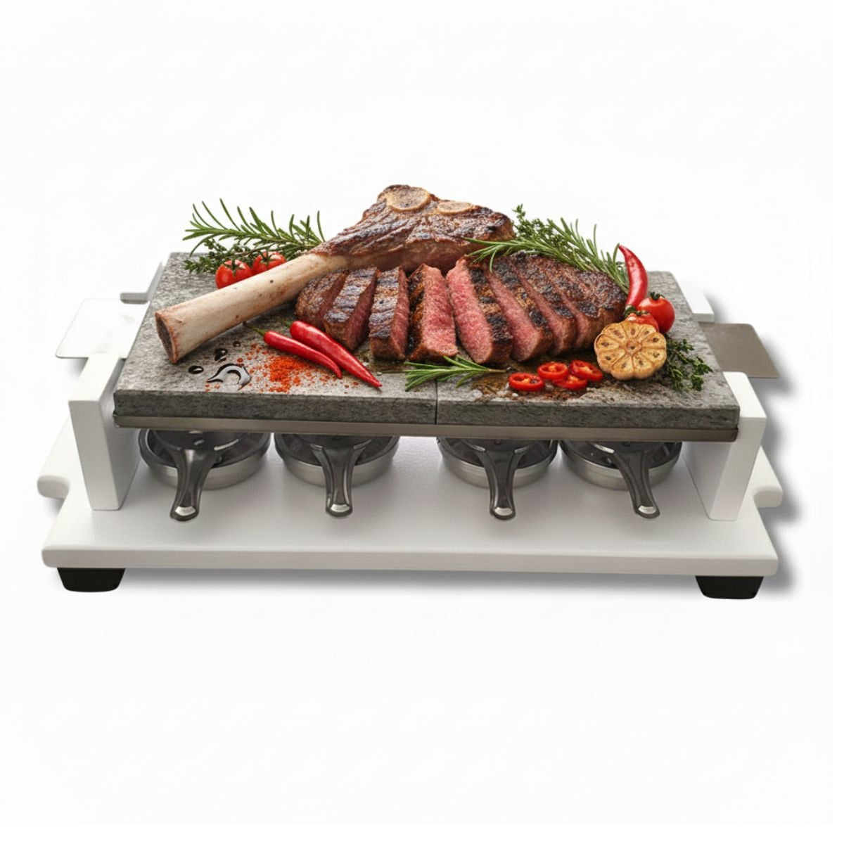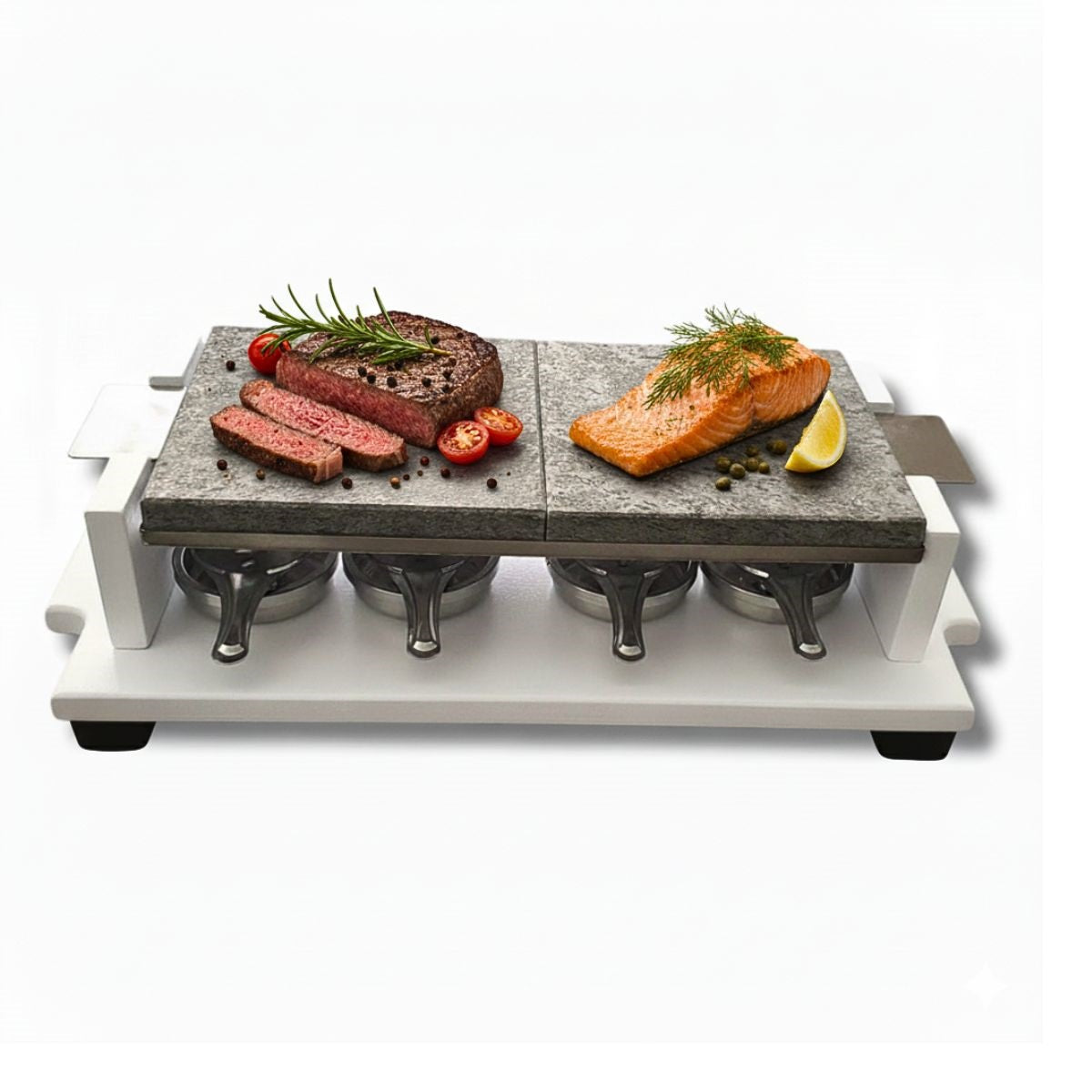 El conjunto se presenta sobre una base estable y moderna, que añade un toque de sofisticación a cualquier mesa. Los pequeños quemadores aseguran una distribución uniforme del calor, optimizando la retención térmica de las piedras.