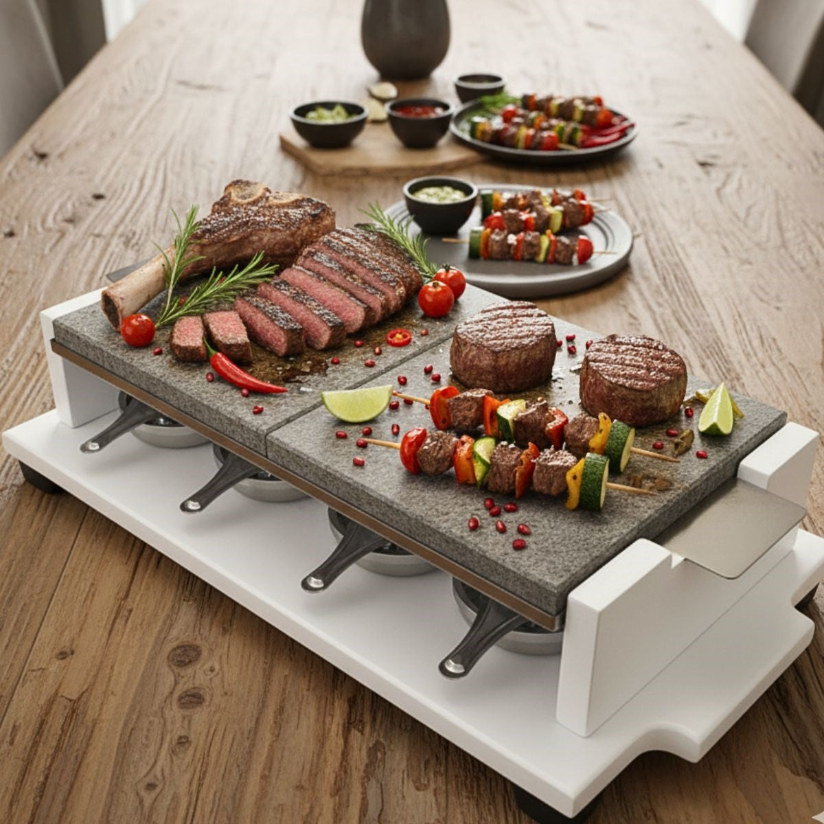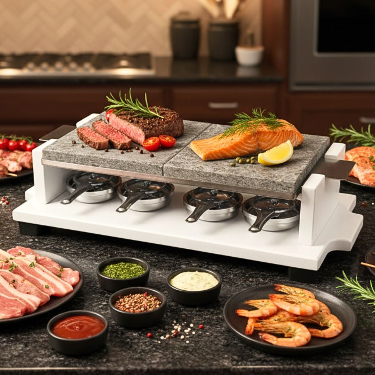 - Cocina a tu Gusto: Permite a cada persona cocinar su filete, salmón o marisco exactamente al punto que prefiera, desde sellado hasta bien hecho.