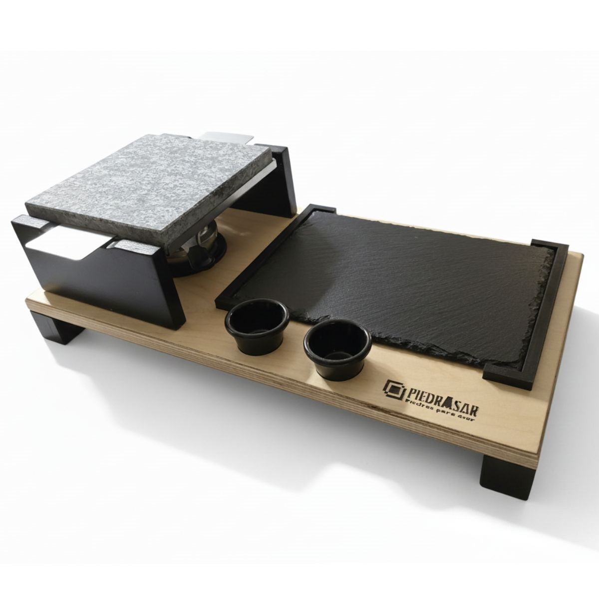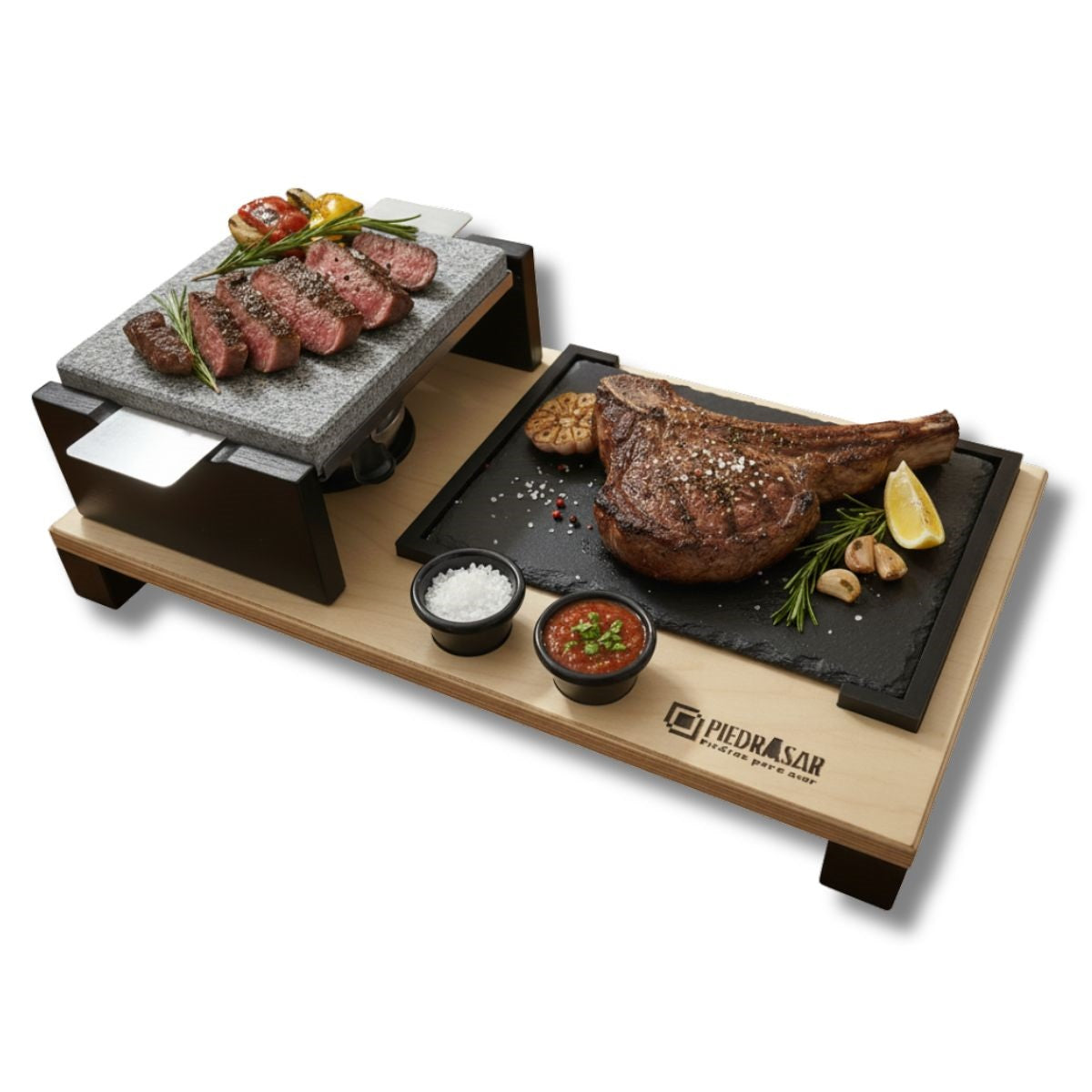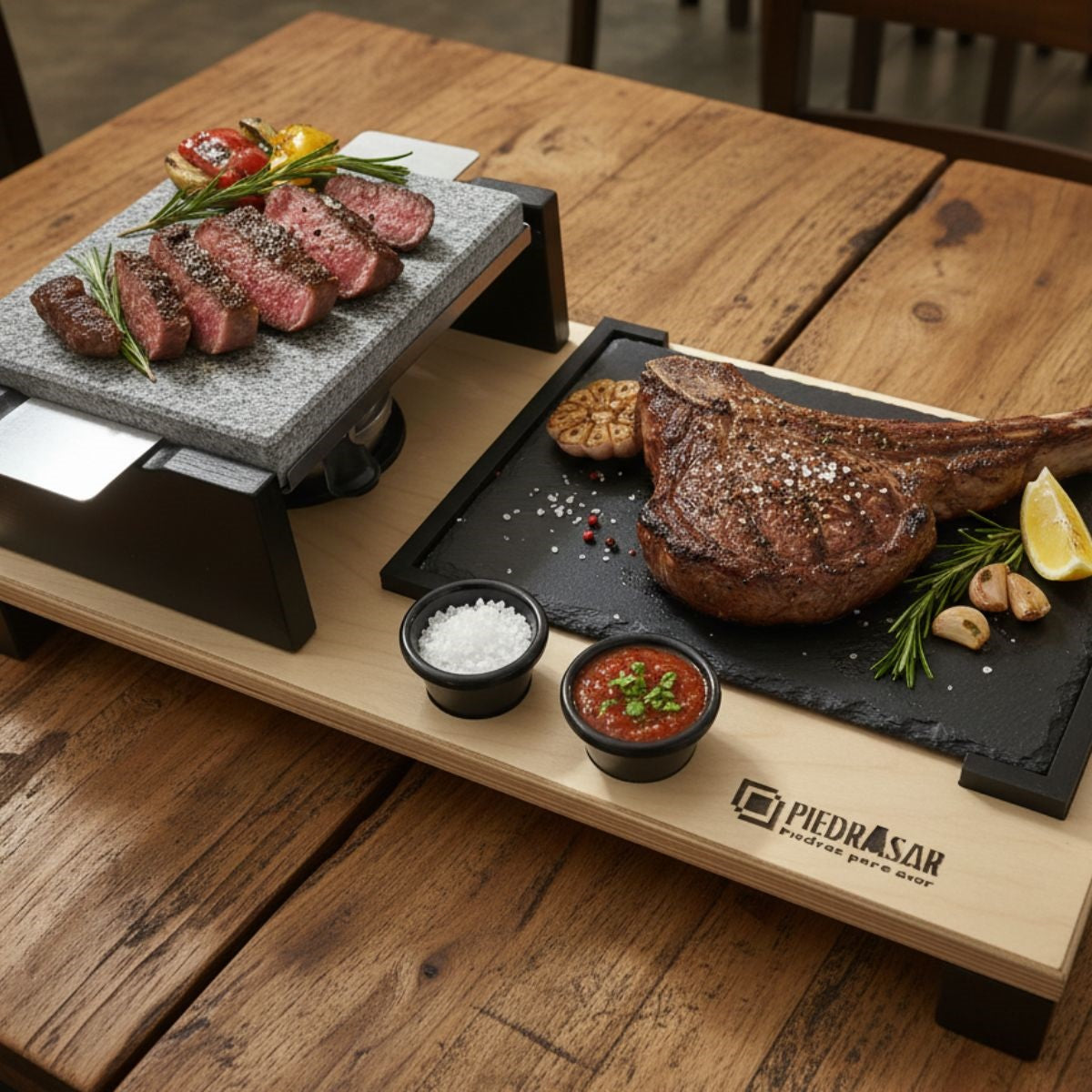 Eleva tus comidas a una nueva dimensión con el Set Gourmet PIEDRASAR. Diseñado para los amantes de la buena mesa y las experiencias compartidas, este conjunto combina la robustez de la piedra volcánica y la sofisticación de la pizarra natural para un asado perfecto en tu propia mesa.