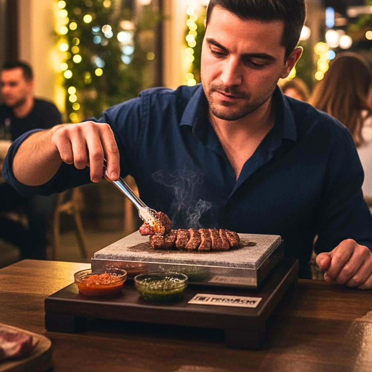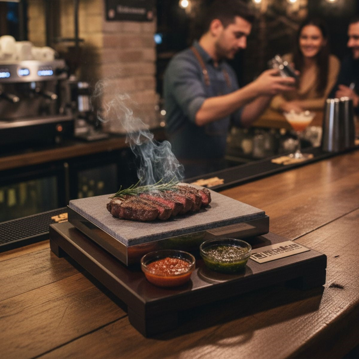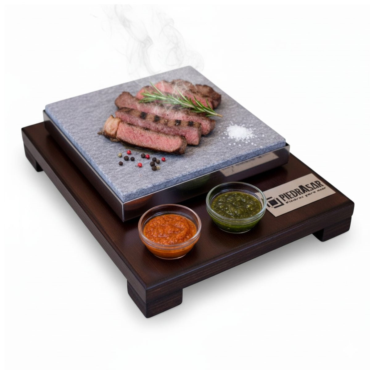 Disfruta de una experiencia gastronómica única con esta piedra volcánica de 20x20 cm, perfecta para cocinar carnes, pescados o verduras directamente en la mesa, conservando todo su sabor y jugosidad.
