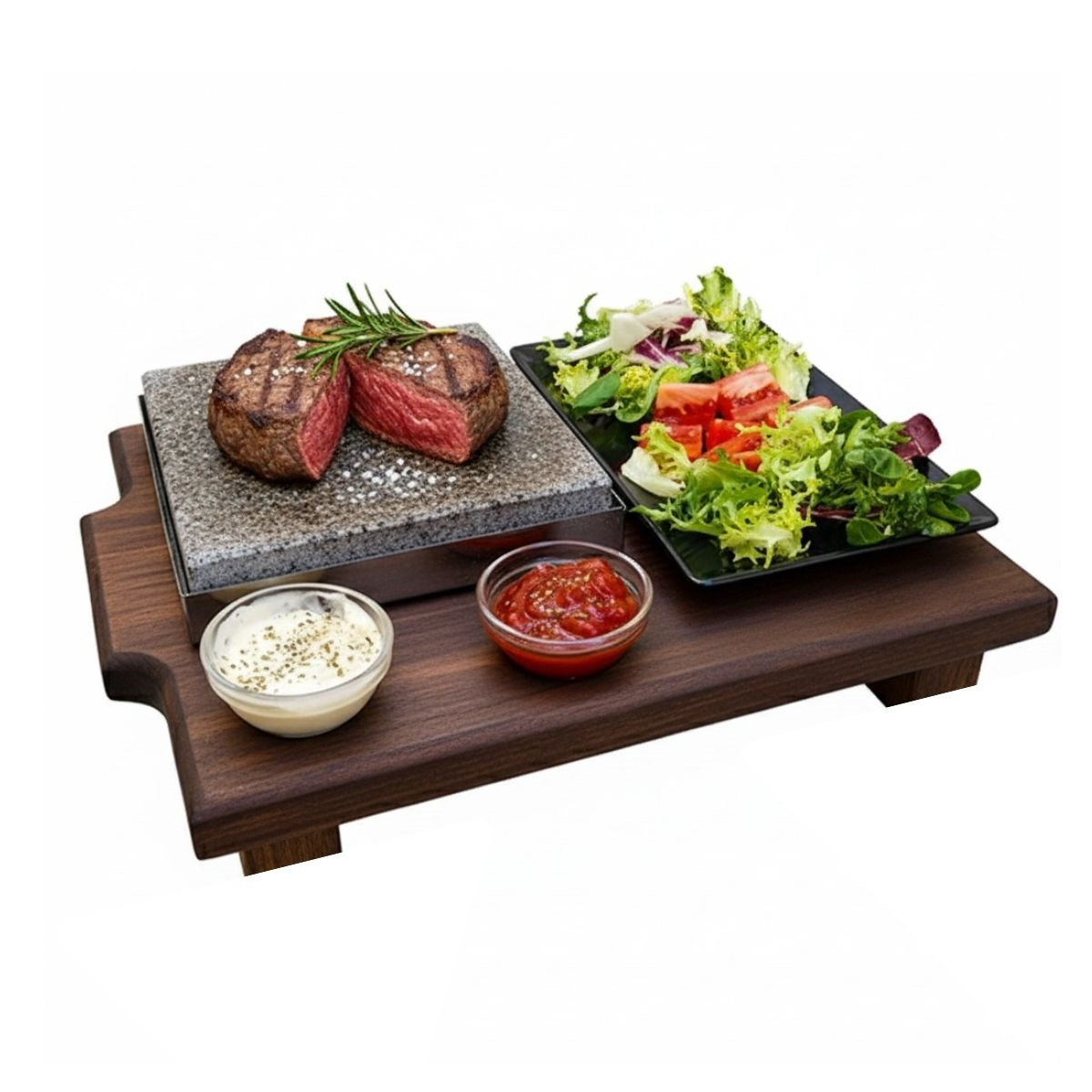 - Elegante Base de Madera (Diseño Integrado): Una robusta base de madera que no solo protege tu mesa, sino que también ofrece un espacio práctico con la piedra caliente y con el plato de acompañamiento. Su diseño es estético y funcional.