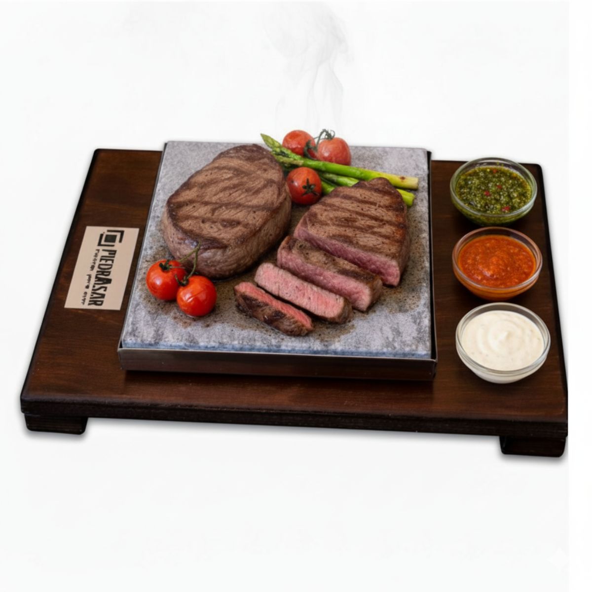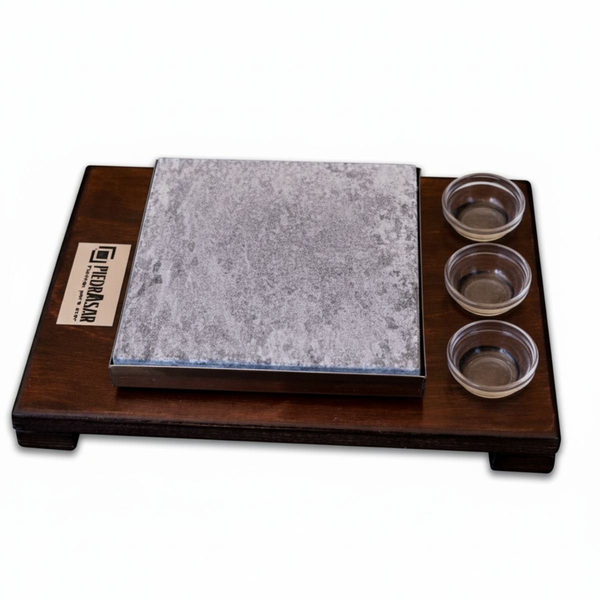 🥩 Piedra para Asar de 20x20 con tres salseros y placa personalizada