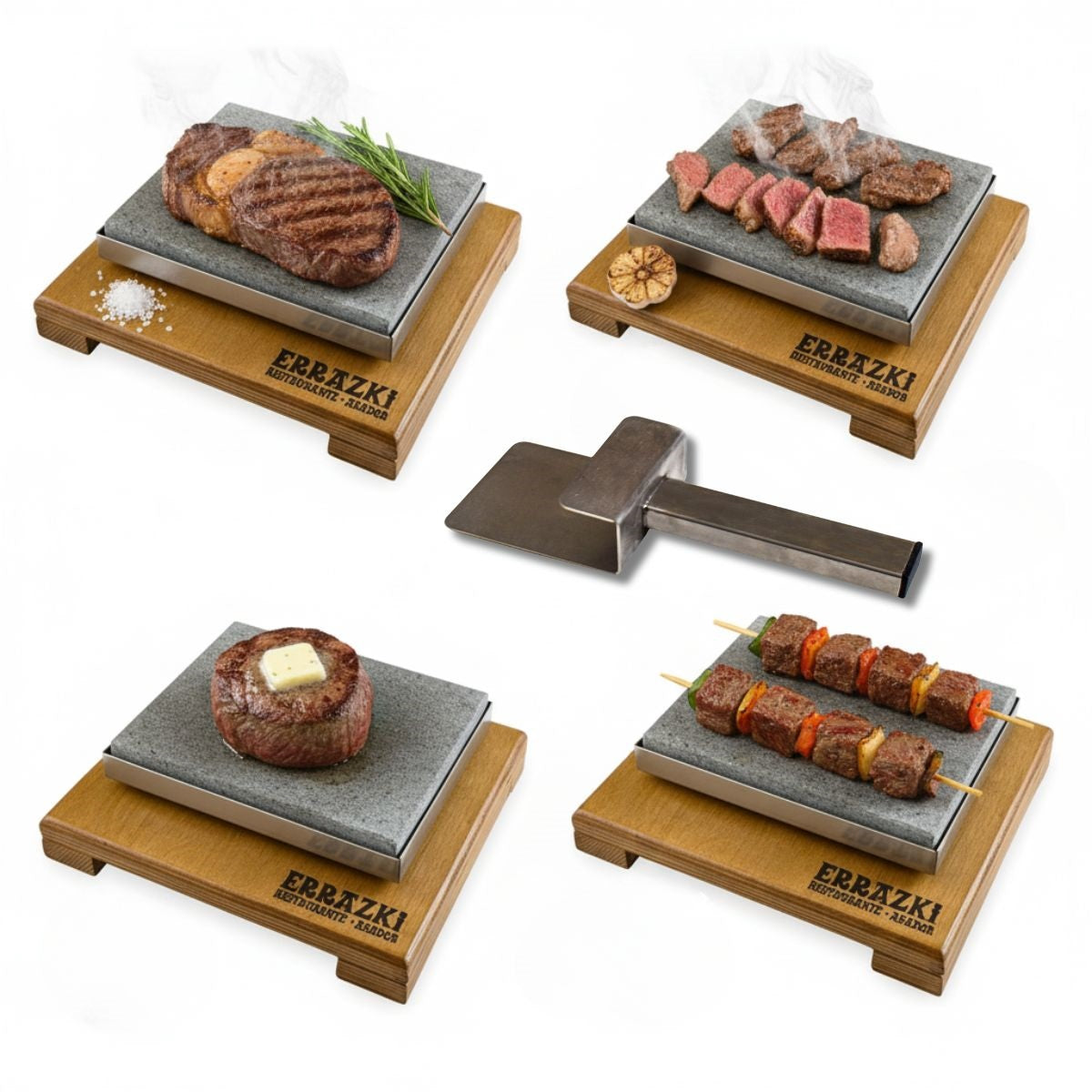 Este pack de 4 unidades de piedra volcánica para asar está especialmente diseñado para bares, restaurantes y asadores que desean ofrecer una experiencia gastronómica exclusiva, permitiendo a los comensales cocinar su plato directamente en la mesa con un acabado perfecto.