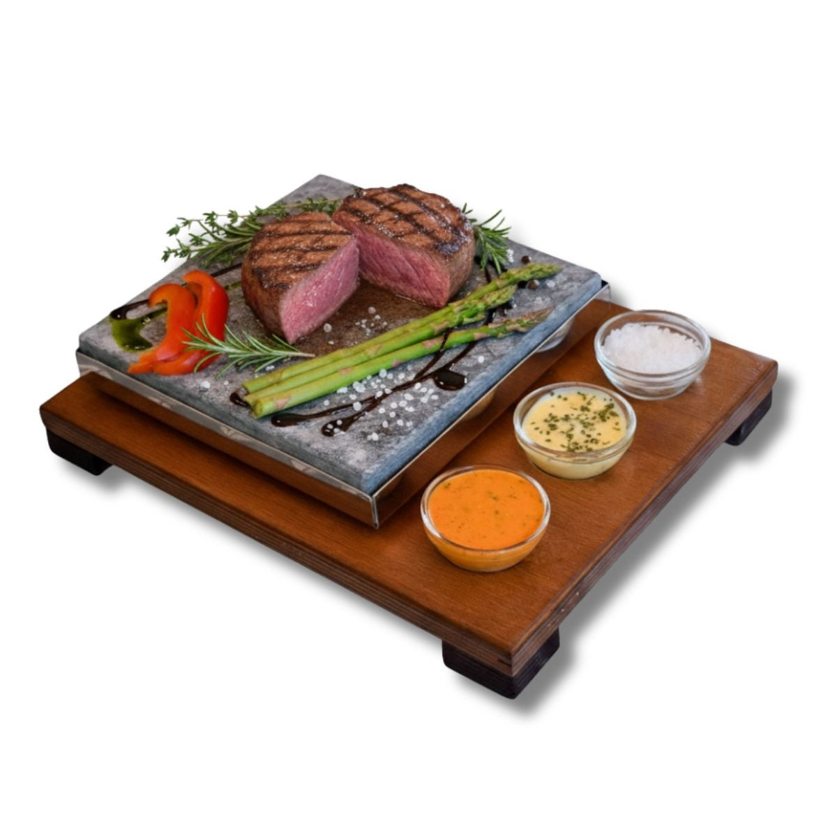 Piedra para Asar 20x20 con Base de Madera y tres salseros